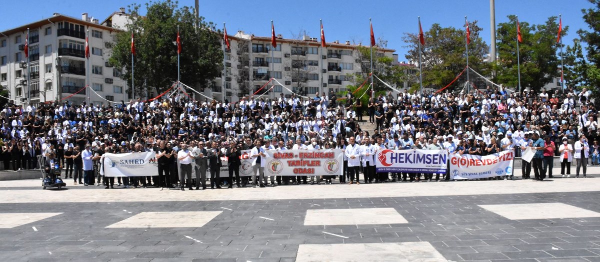 Sivas’ta sağlık alanında faaliyet gösteren çeşitli sendika ile birliklere bağlı üye ve temsilcileri kent meydanında basın açıklaması yaparak Ekrem Karakaya’nın öldürülmesine tepki olarak önlüklerini çıkardı.