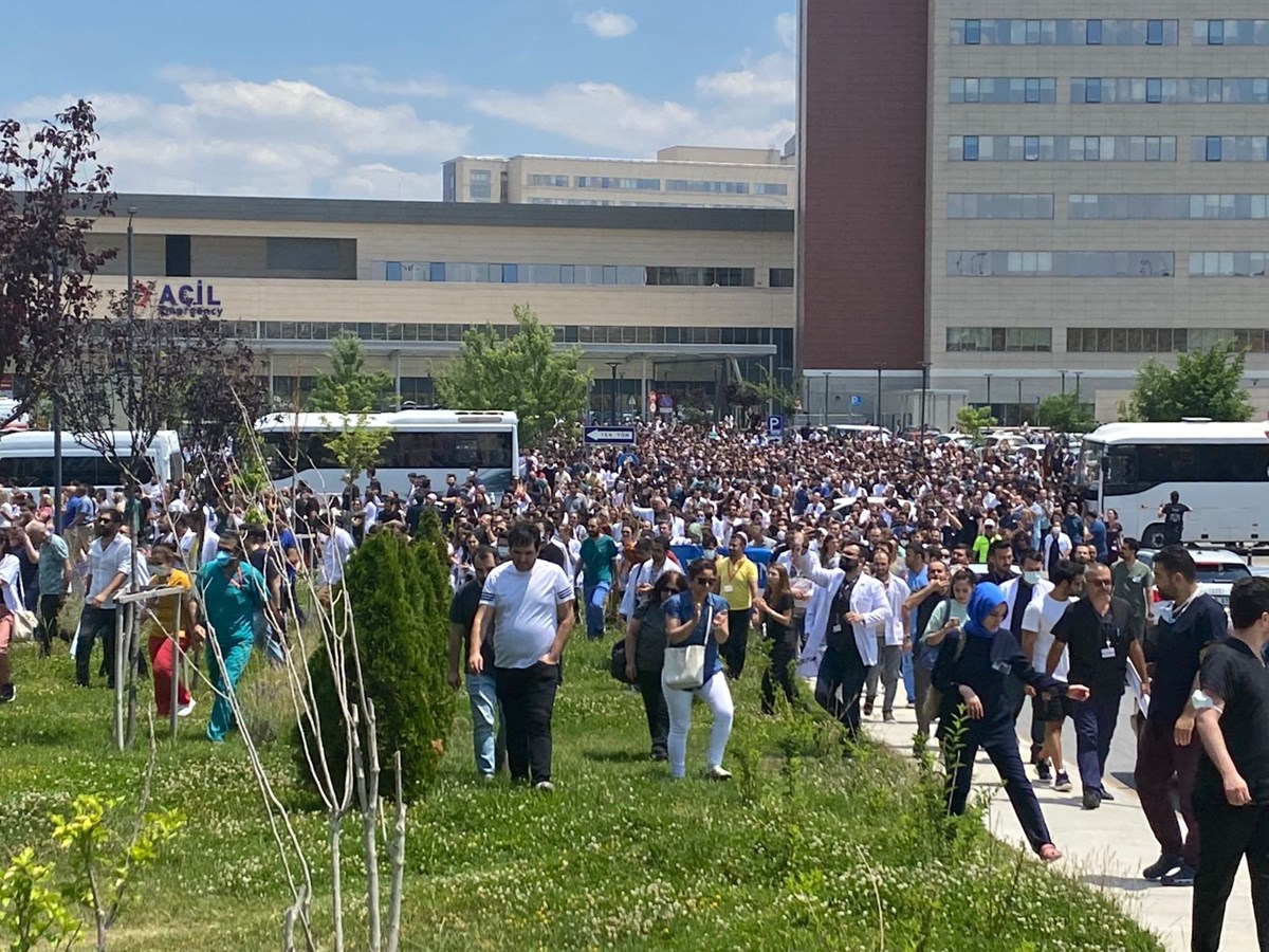 Ankara Şehir Hastanesi’nde görev yapan doktor ve hemşirelerinden oluşan yaklaşık bin kişilik grup da, Hekim ve Diğer Sağlık Çalışanları Kamu Sağlık ve Sosyal Hizmetler Sendikası’nın çağrısıyla hastanenin acil servisi önünde toplandı.
