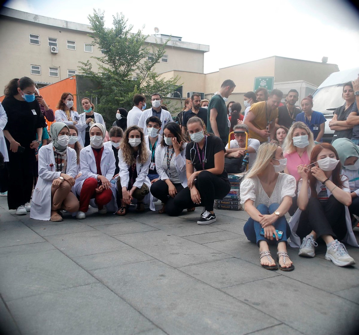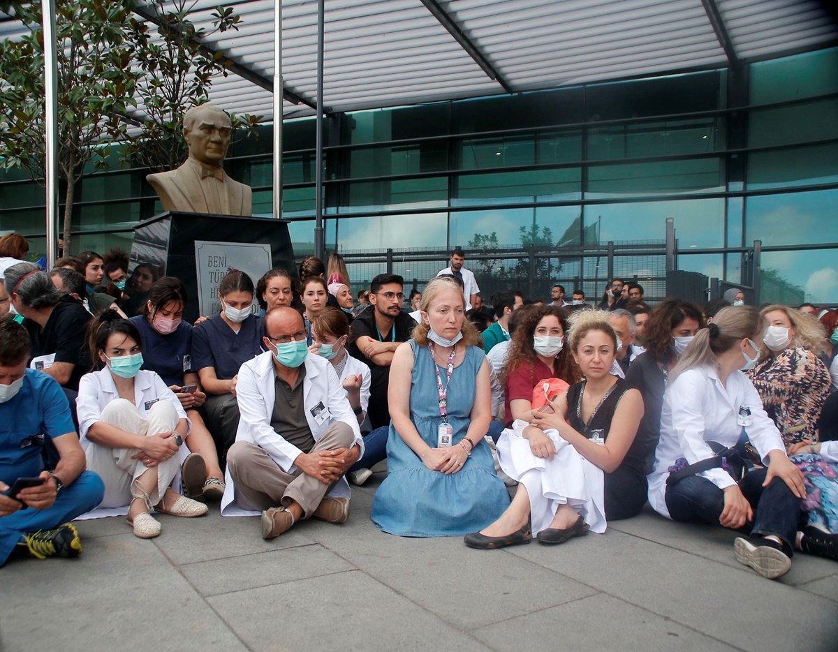 Hastane çalışanları bahçede 15 dakika boyunca sessizce oturarak protesto eylemi gerçekleştirdi.