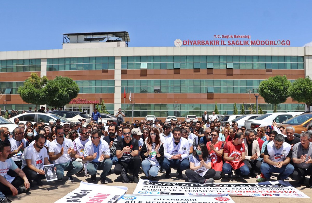 Diyarbakır’da da sağlık çalışanları İl Sağlık Müdürlüğü önünde oturma eylemi yaptı.