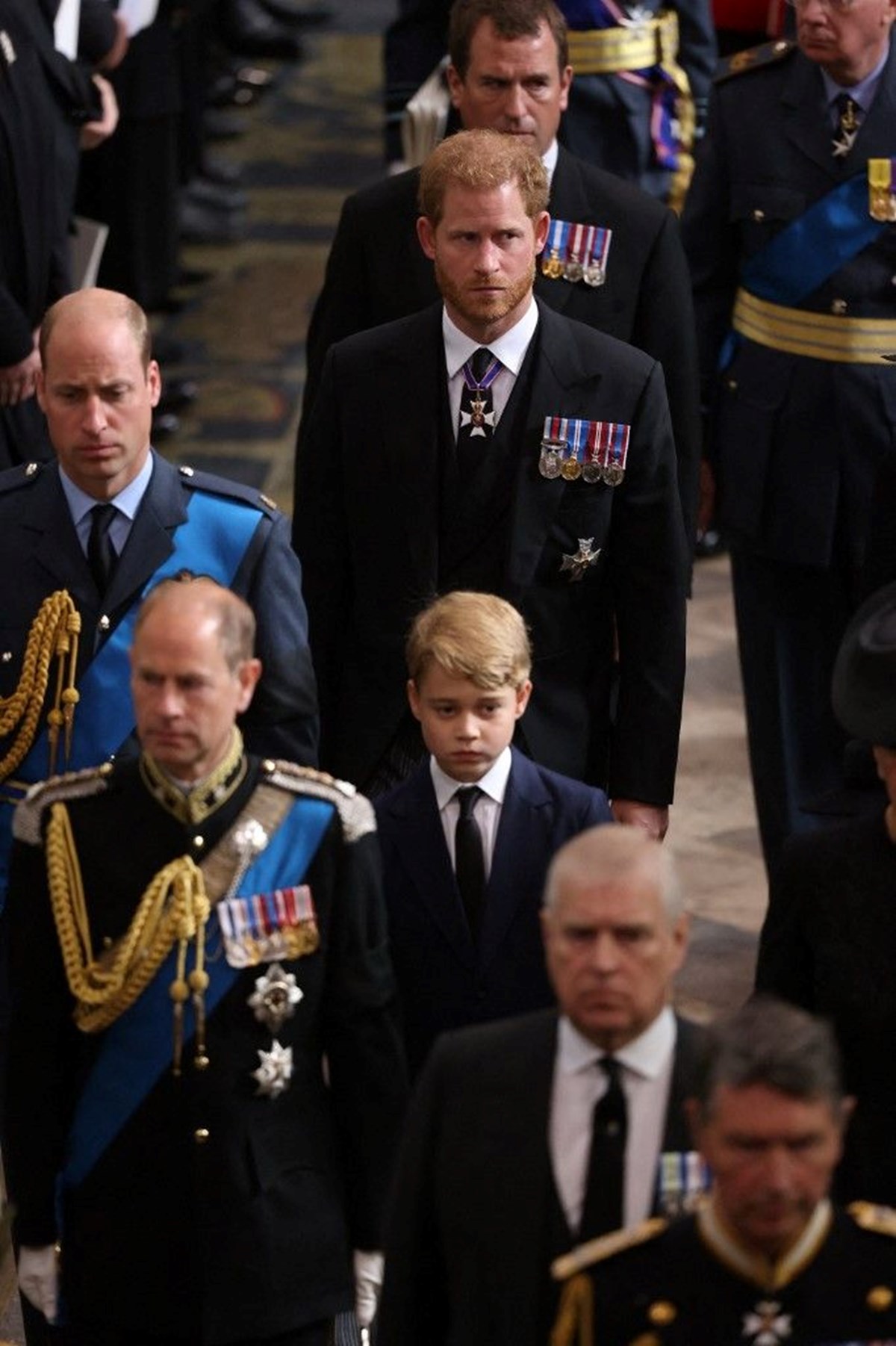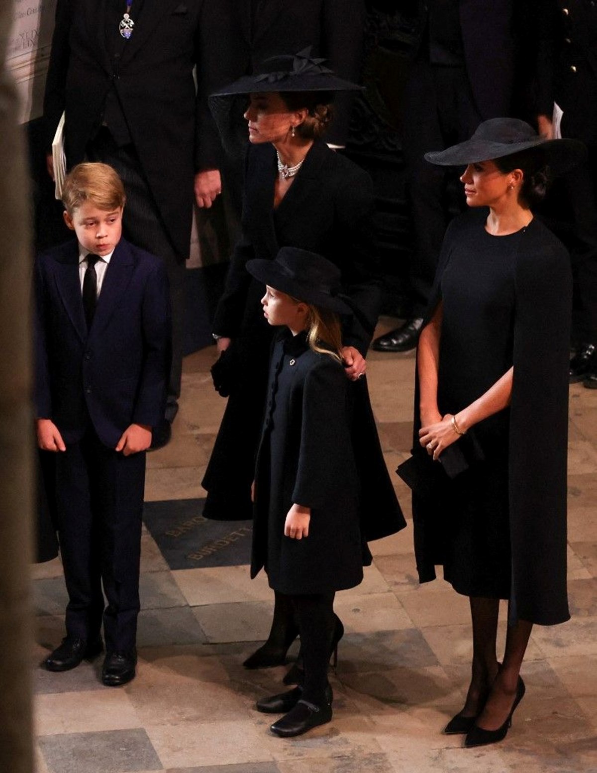 İngiltere, 70 yıl tahtta kalan Kraliçe’sine veda ederken, cenaze töreninde gözler kraliyet ailesi üyelerinin üzerinde. Charles’ın ‘kral’ olmasının ardından onun ‘Galler Prensi’ unvanını alan Prens William ile artık ‘Galler Prensesi’ olarak anılan Kate Middleton, cenazeye çocukları Prens George ve Prenses Charlotte ile birlikte katıldı. Ama cenazenin asıl dikkatleri çeken iki ismi, kraliyet görevlerini bırakıp ABD’ye taşınan Prens Harry ve Meghan Markle çifti oldu.İngiltere’nin en uzun süre tahtta kalan hükümdarı Kraliçe Elizabeth için önce Londra’nın merkezindeki Westminster Kilisesi’nde tören düzenlendi.Kilisede Kral III. Charles ile eşi Konsort Kraliçe Camilla, Prens William ve Kate Middleton en ön sırada yer alırken Harry ve Meghan çifti, ikinci sıradan töreni takip etti.Sussex çifti, Prenses Beatrice ve eşi Edoardo Mapelli Mozzi ile yan yana durdu.41 yaşındaki Meghan ile 38 yaşındaki Harry, Kraliçe’nin 8 Eylül’de hayatını kaybetmesinin ardından İngiltere’ye döndü. Çift, üç yaşındaki oğulları Archie ile 15 aylık kızları Lilibet’i ABD’de bıraktı.Kilise töreni başlamadan önce Sussex Dükü Harry, Kraliçe’nin tabutunun arkasında onunla birlikte yürümek için kardeşi Prens William ile olan kavgasını bir kenara bıraktı ve birlikte görüntü verdi.Harry artık kıdemli bir kraliyet mensubu olmadığı için üniforma yerine sivil bir takım elbise giydi.Meghan Markle da diğer tüm kraliyet ailesi kadınları gibi siyah bir elbise giydi ve şapka taktı.Sussex Düşesi, cenaze töreninde, Harry ile 2018’deki düğünlerinde Kraliçe Elizabeth’in hediye ettiğ inci küpeleri taktı.